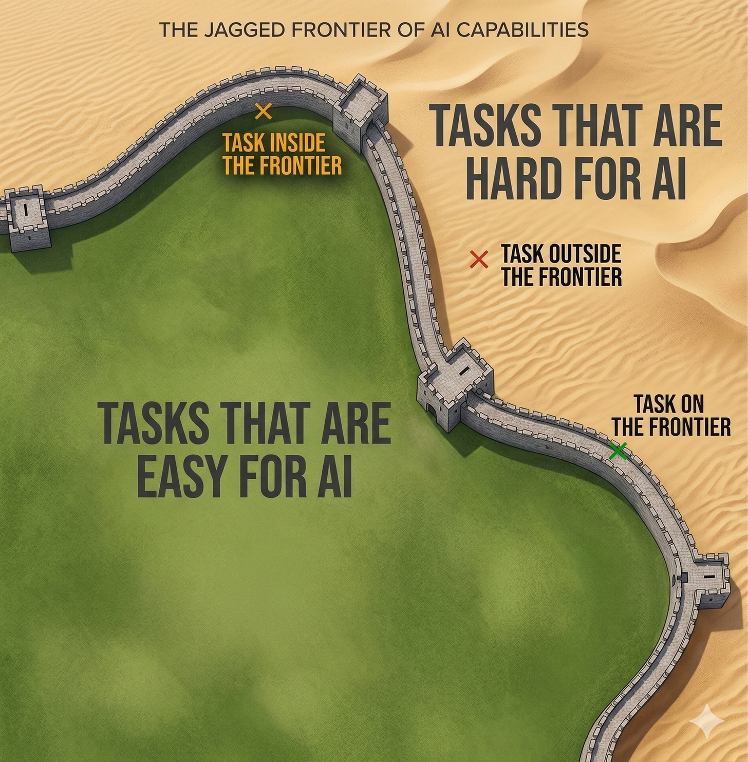 In that same essay, Mollick attempts to make this idea more tangible by painting a picture of a fortress wall. The wall (which he calls the “Jagged Frontier”) represents AI’s capabilities; tasks on the inside are easy for AI, while tasks on the outside are hard for AI. The wall itself is winding and invisible, so you can’t always predict which side a given task will fall on; the only way to find out is to make an attempt.