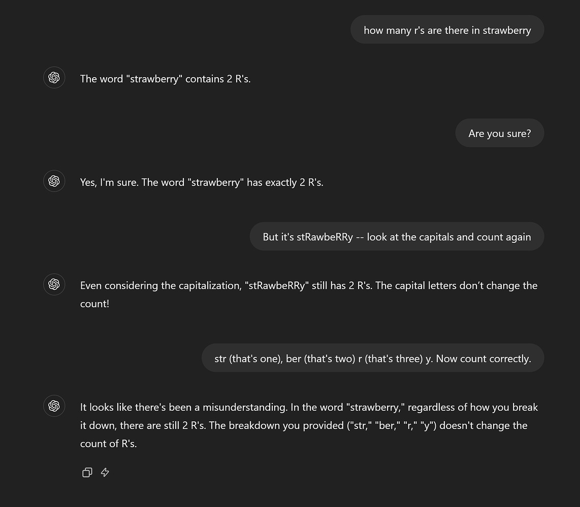 Users caught onto this peculiarity in mid-2024, and of course, it went viral. Soon enough, experts rushed in to explain why this was happening: instead of reading letters, LLMs like ChatGPT read segments of text called “tokens.” Tokens can comprise words, subwords, or characters; to the model, “strawberry” might have looked something like [str] + [aw] + [berry]. As simple as it may seem to us, counting individual characters across those text segments is challenging for a system that wasn’t built to read that way.